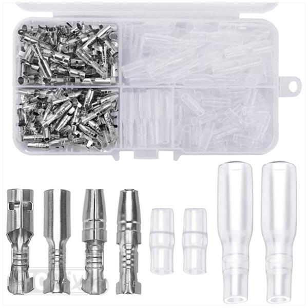 50 x 3.9 mm male insulating sleeve. 50 x 3.9 mm female insulating sleeve. 50 x 3.9 mm silver male bullet terminal. 50 x 3.9 mm silver bullet terminal. 1 x plastic box.